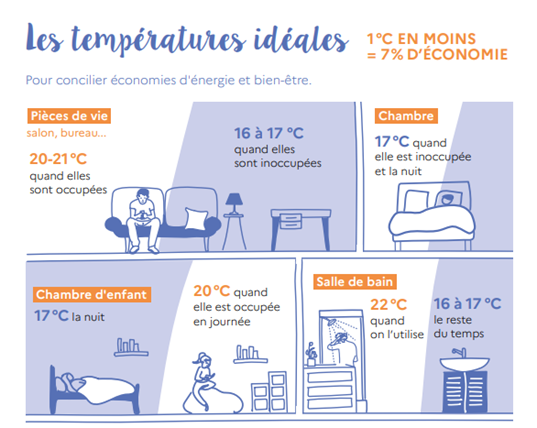 • Baisser le chauffage de 1°C. L’ADEME affirme qu’un degré de chauffage en moins reviendrait à une réduction de 7 % sur la facture d’électricité. C’est un vrai bon plan pour faire des économies et protéger la planète.